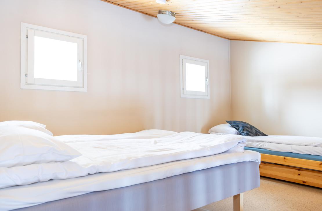 Ampio loft di 9 m² con tre letti separati, scale ripide per raggiungere il loft.