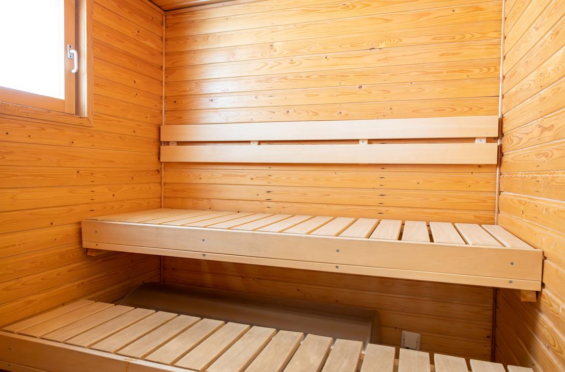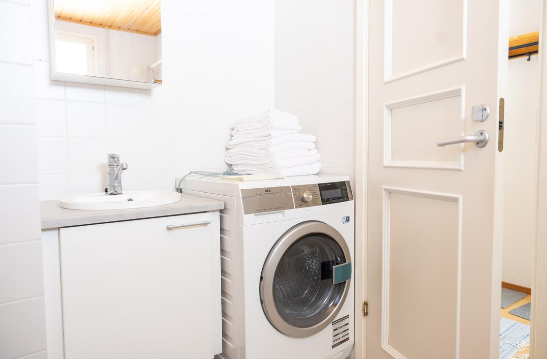 Sauna privata, bagno/WC e lavatrice con asciugatrice nella lavanderia.