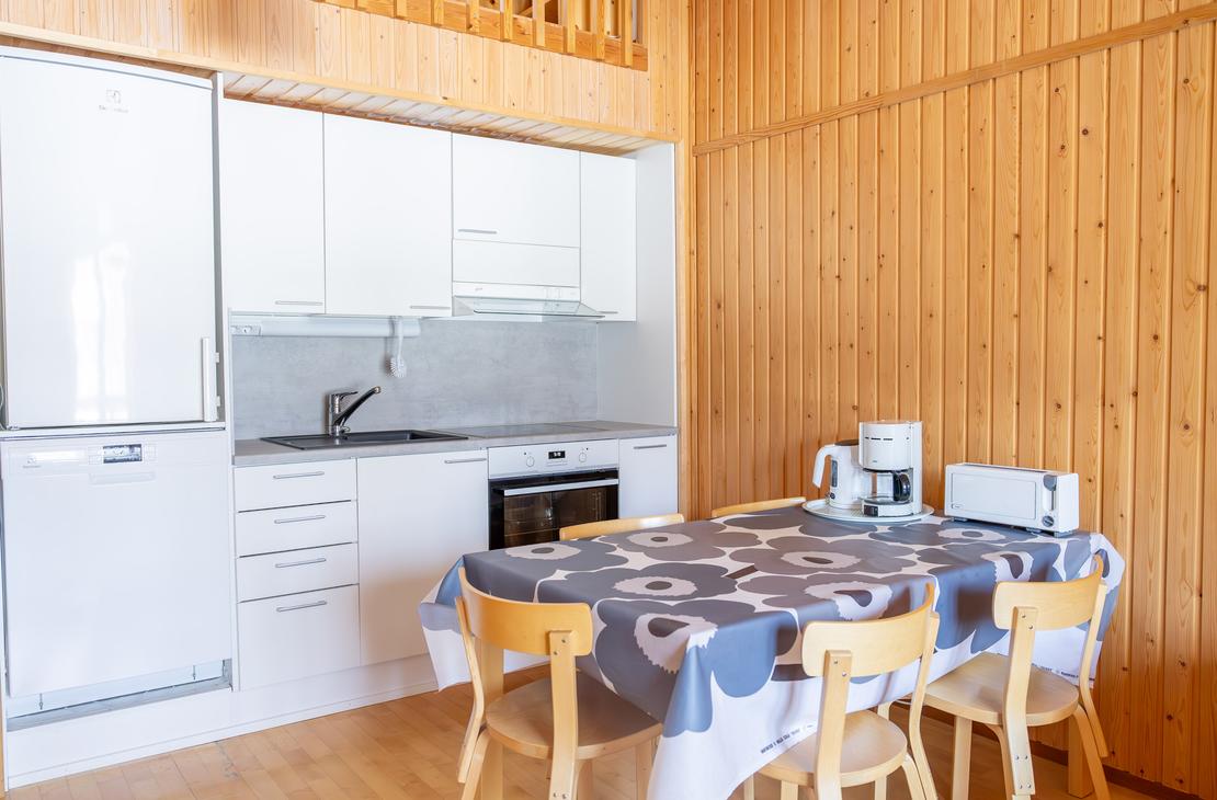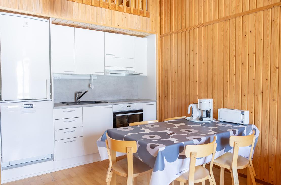 Cucina ristrutturata con tavolo da pranzo per 5 persone.