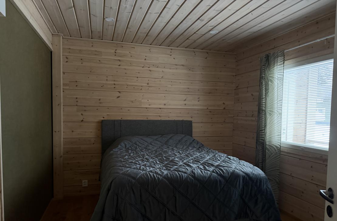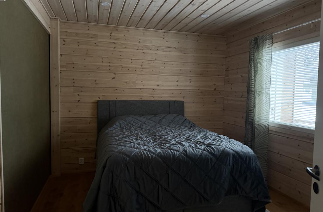 Yksi makuuhuone alhaalla, josta pääsee suoraa pesu-ja saunatiloihin