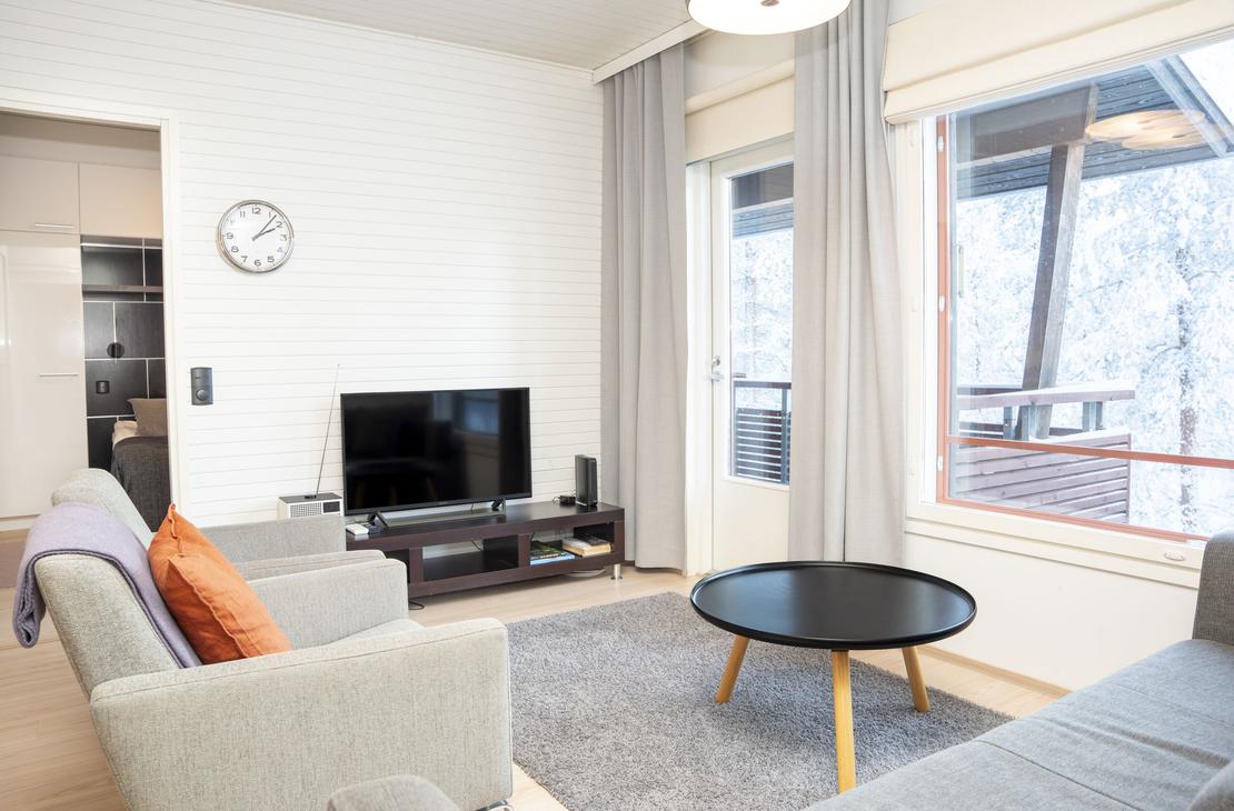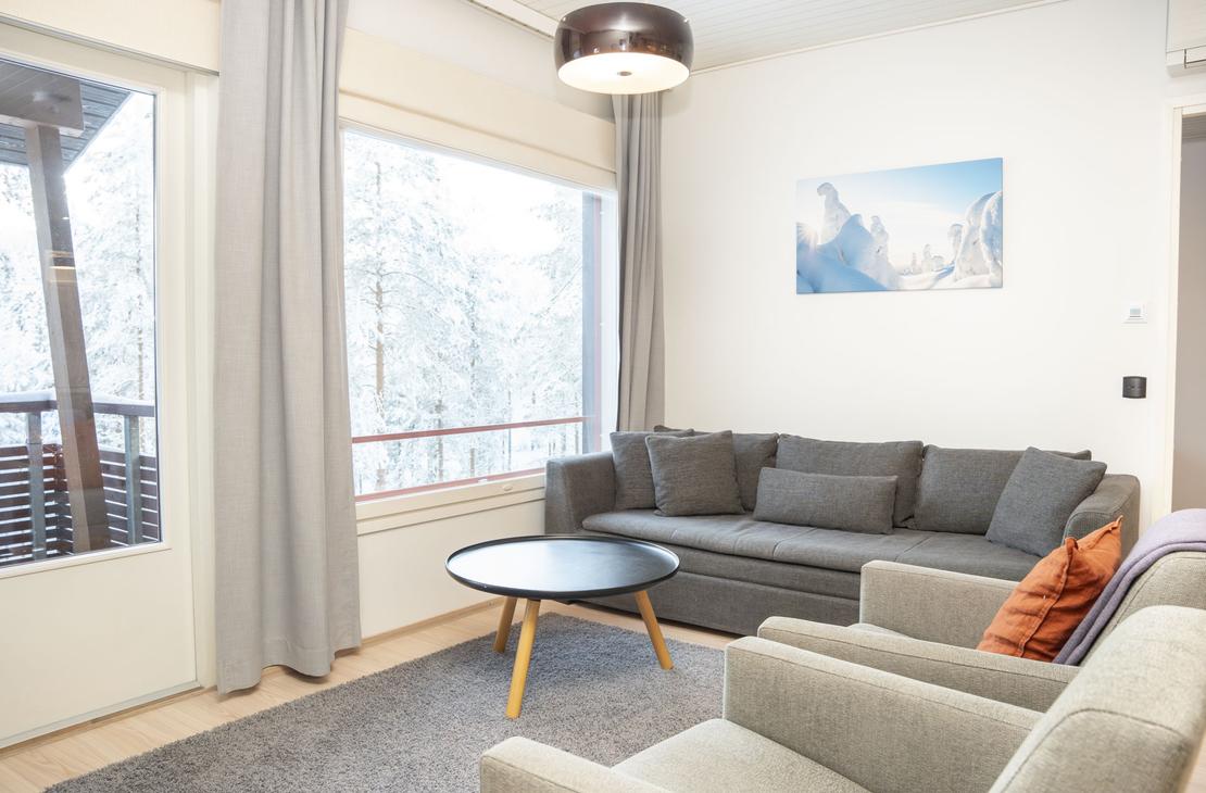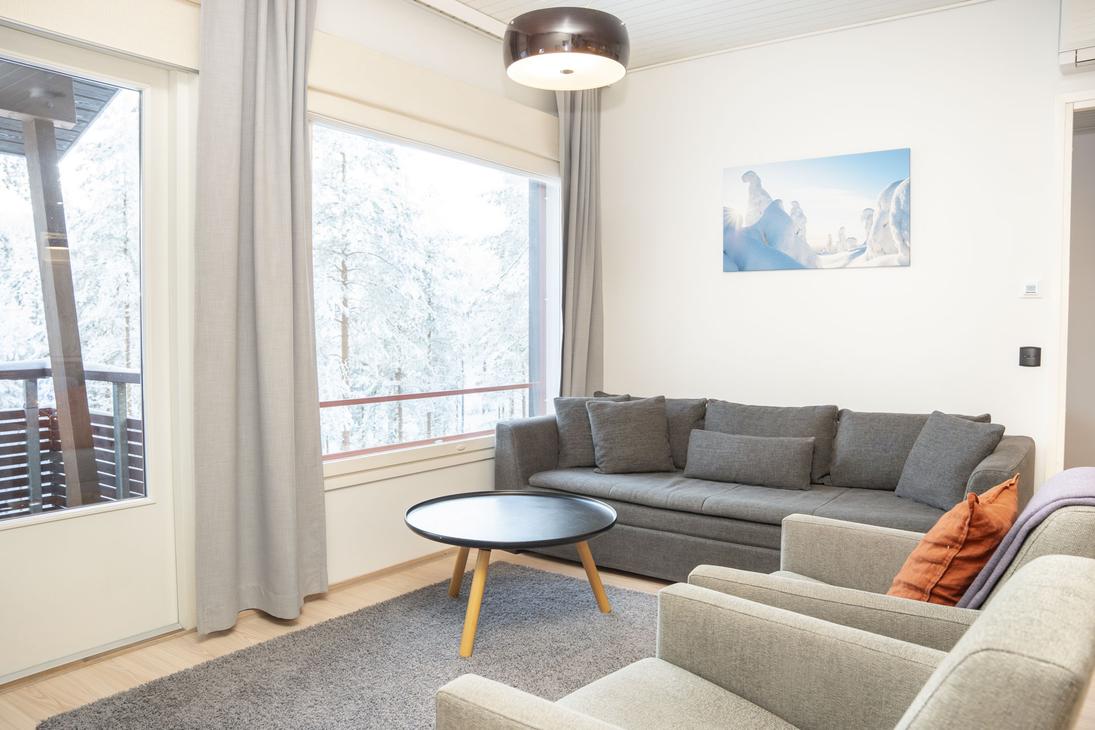 Olohuoneen sohva avattavissa tarvittaessa 1-2 henkilölle.