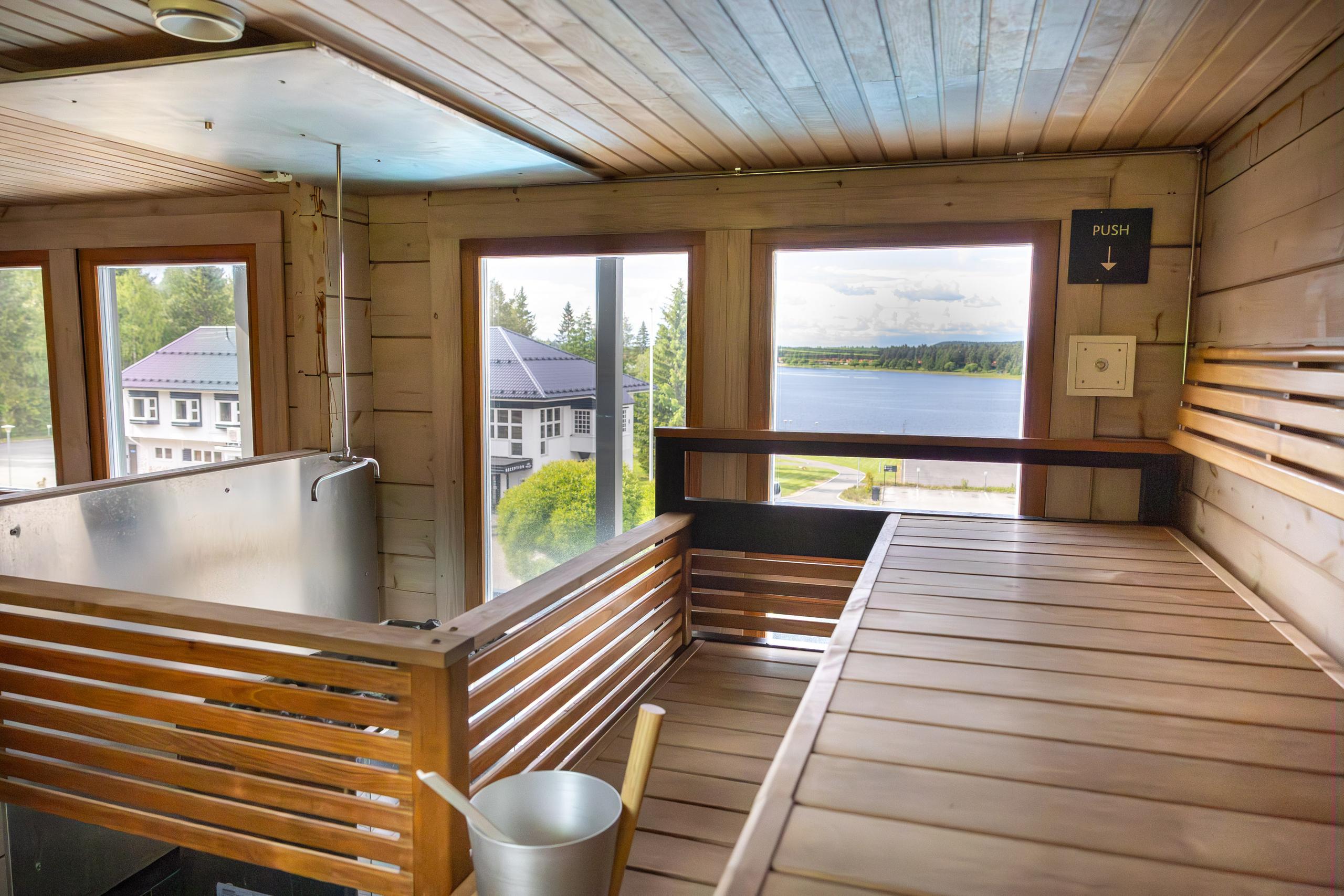 Honkalinna panorama sauna on ilmaiseksi käytössäsi saunavuoroilla, kun majoitut Suites huoneistoissa. Tästä upeasta maisemasaunasta avautuvat upeat näkymät Nuasjärvelle. Saunan edessä on ulkouima-allas, joka on käytössä ympäri vuoden, talvisin se toimii avantona.